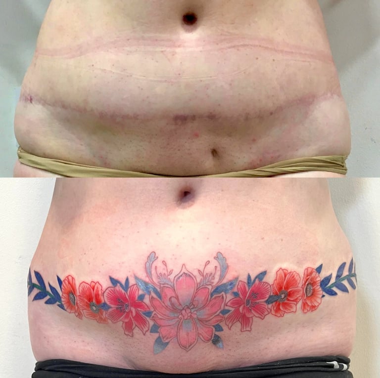 Cómo aprovechar el diseño del tatuaje para cubrir las dos cicatrices.