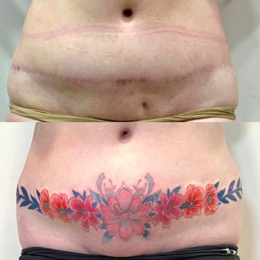 Our scar-specialized tattoo artist, Gustavo Lesmes, knew how to take advantage of the tattoo design to cover the two scars since both were very far apart. The design is totally personalized, unique and unrepeatable, since it took him more than a week of study and drawing to get the dimensions of the scar right to achieve the delicacy, femininity and elegance in her body.