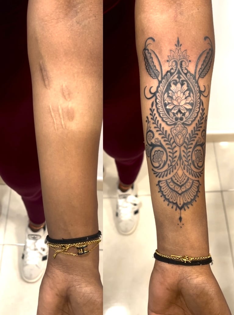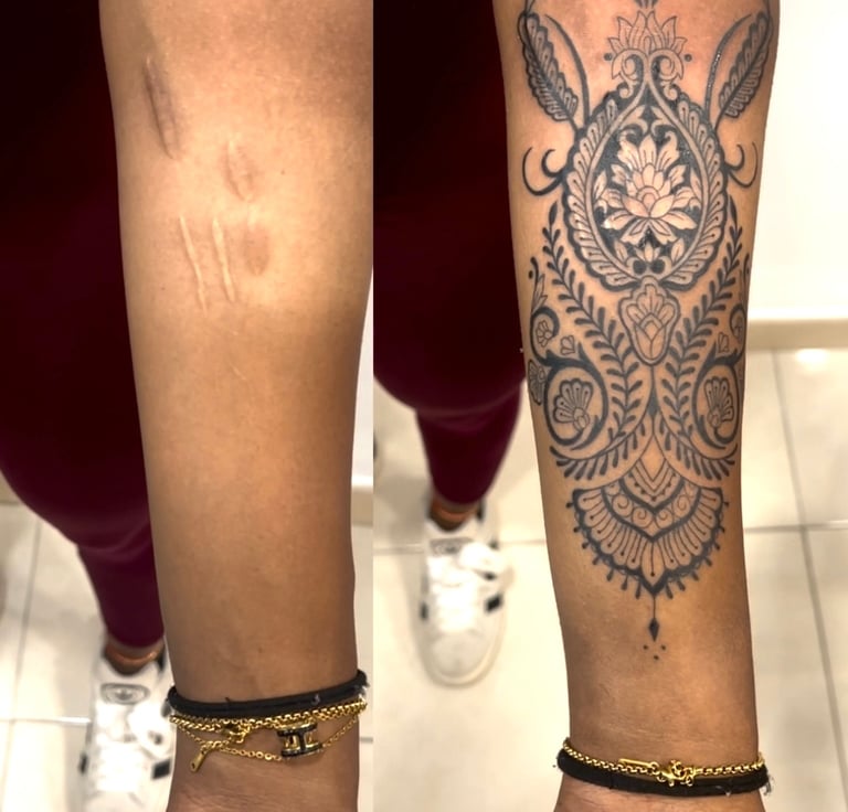 She guided us a little about the style and design she wanted to cover her scar, it takes a few extra hours of prior study to get the correct placement of the design and that it fits with the greatest precision the fact of covering this scar with clear samples of keloid.