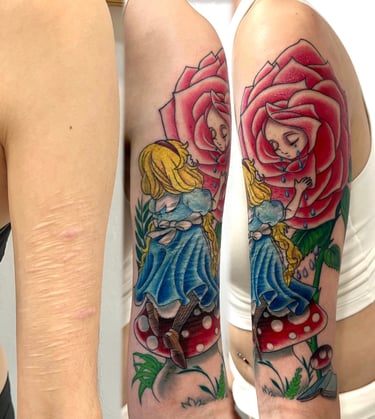 Although keloids and cuts will continue to exist, the tattoo camouflages and conceals the affected area quite well, making the visual attention of the arm go to the composition of the tattoo itself and not to the scars.
