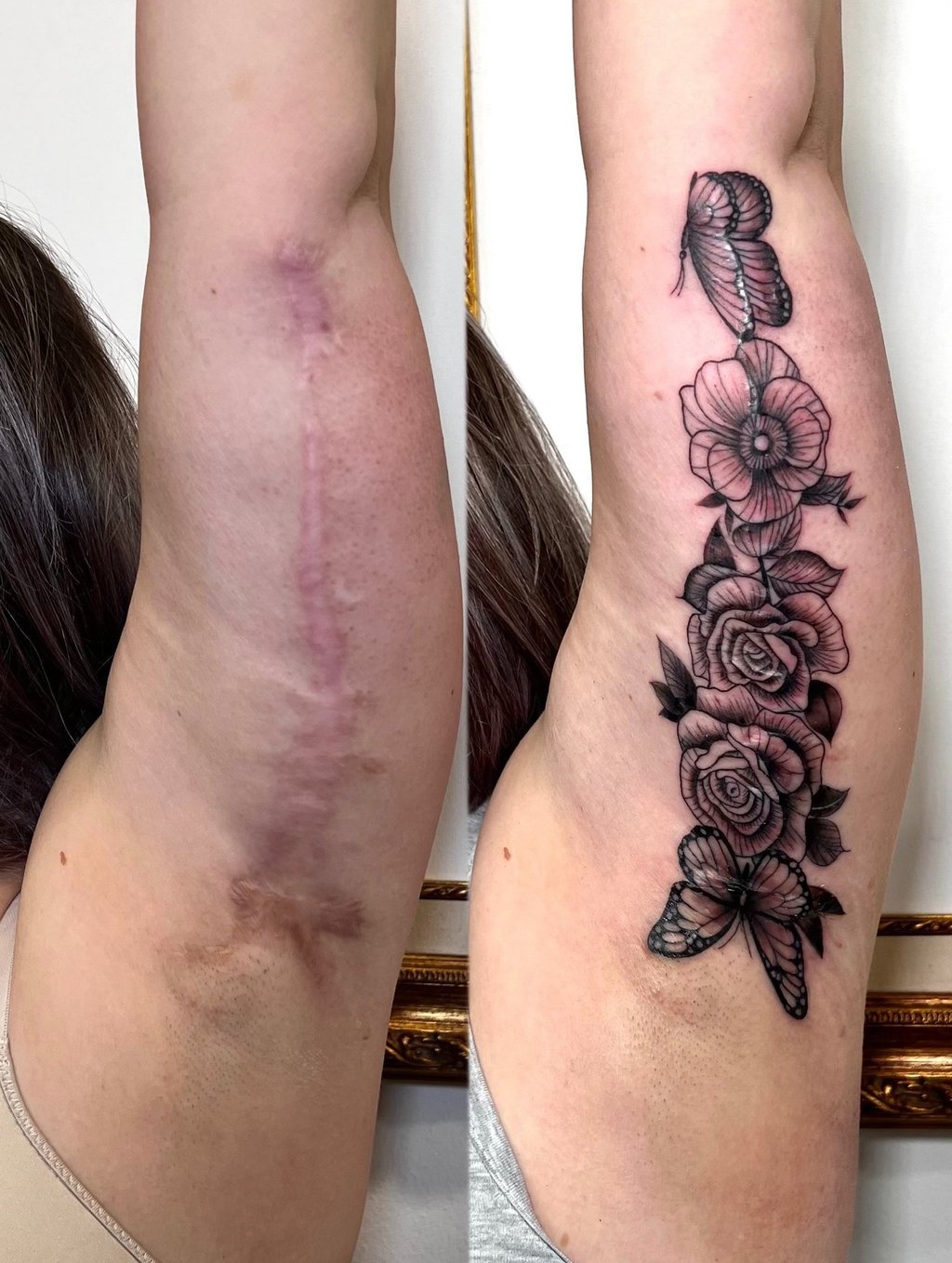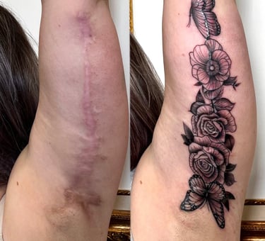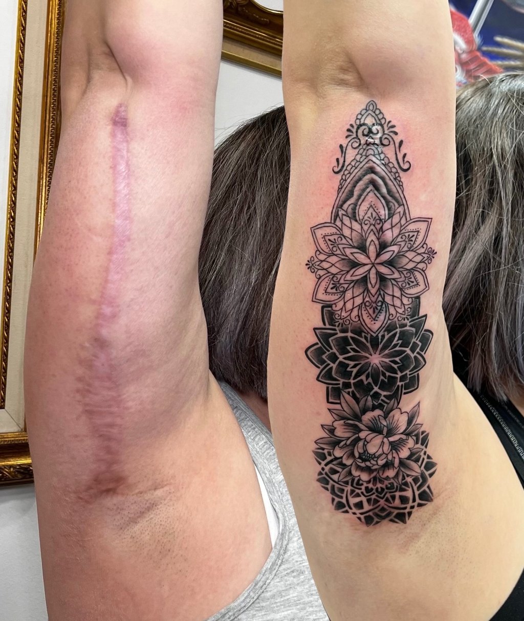 Las cicatrices son bastante asimetricas, lo cual es bastante complicado acertar con la colocación del diseño, y que tapen correctamente y camuflen de manera eficiente los queloides producidos por la cirugía.